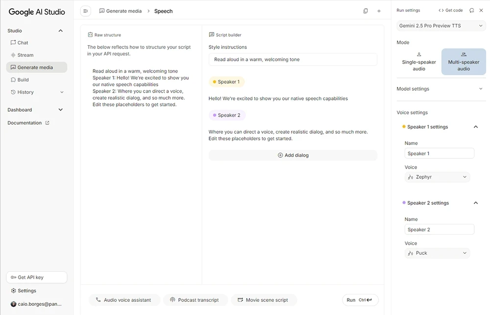É possível testar o Text-to-Speech gratuitamente no Google AI Studio.