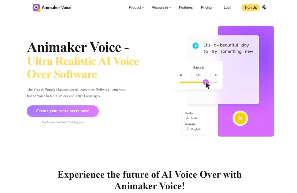 Animaker Voice é uma ferramenta de voz de IA online projetada para transformar rapidamente e de forma acessível texto em narrações semelhantes a humanas. Com mais de 800 vozes em 170 idiomas, é ideal para criar dublagens para vídeos de marketing e redes sociais sem equipamentos profissionais.