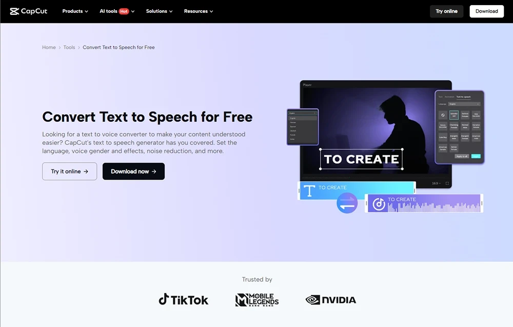 CapCut é um editor de vídeo completo que incorporou funcionalidades de texto para fala diretamente na plataforma. Com ele, você pode converter texto em narrações, ajustar parâmetros como velocidade e tom, e aplicar efeitos sonoros sem sair do editor.