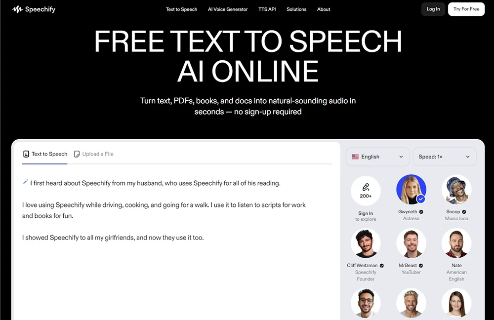 Speechify oferece narrações realistas em mais de 60 idiomas com mais de 1.000 vozes disponíveis. É amplamente utilizado para vídeos de vendas, anúncios, treinamentos, podcasts e até audiolivros—sendo uma solução prática tanto para criadores individuais quanto para empresas.