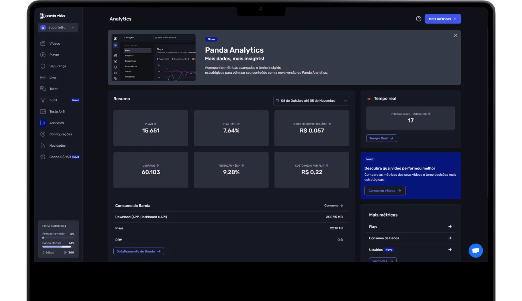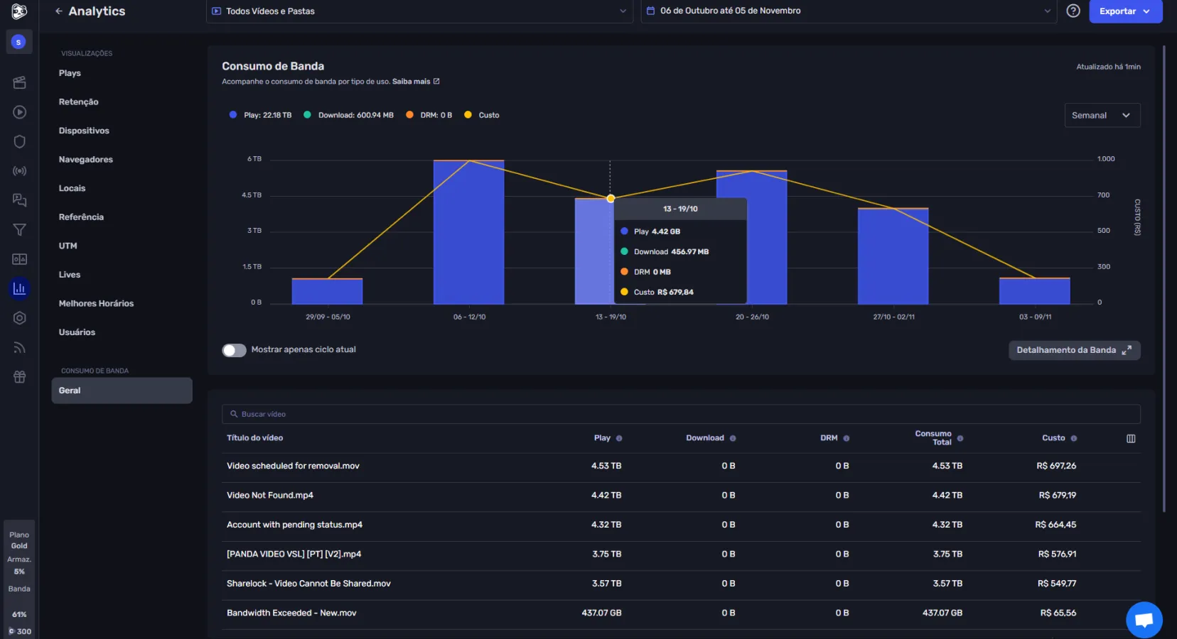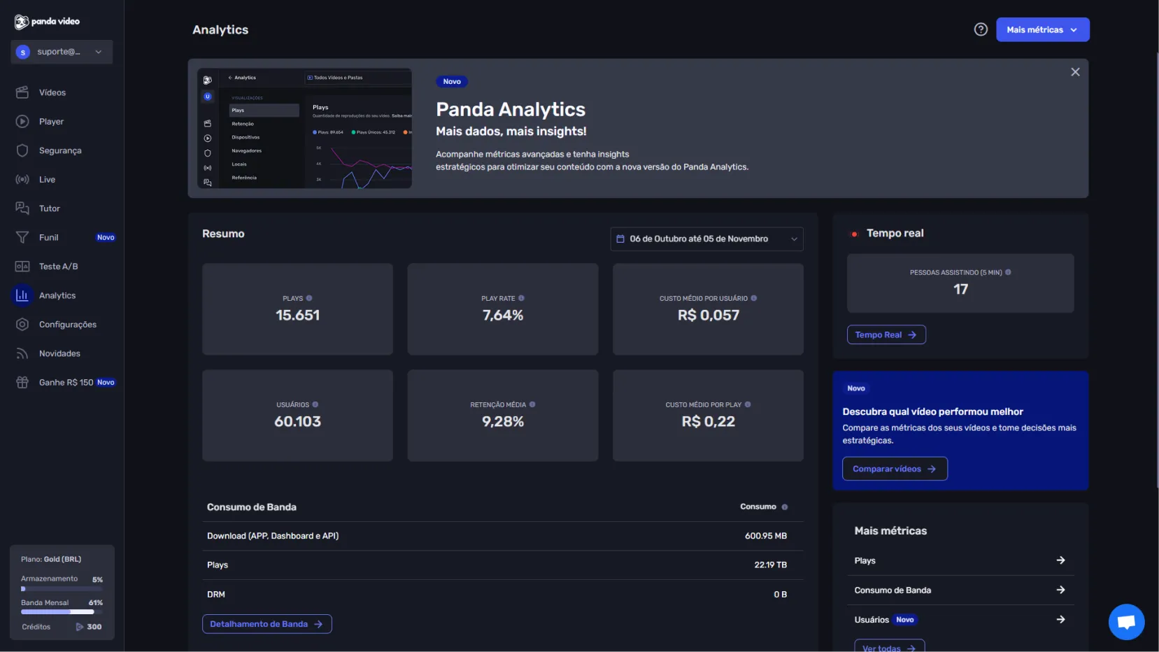 Acesse um painel com um resumo dos últimos 30 dias, incluindo reproduções, retenção média e uso de largura de banda.