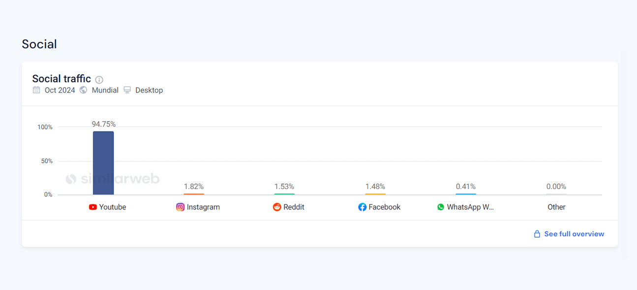 Más de 100,000 visitantes provienen del tráfico social, siendo YouTube responsable del 94.75% de eso.